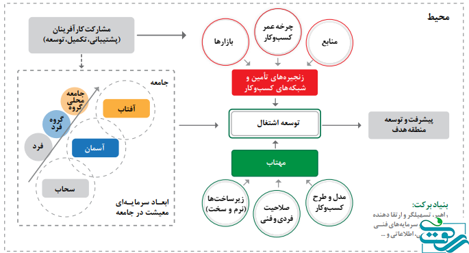 بنیاد برکت، به عنوان یکی از زیرمجموعه‌های ستاد اجرایی فرمان حضرت امام (ره) چندسالی است که به صورت فعالانه‌ در حوزه ی توسعه خرد و روستایی، مشاغل خانگی و کارآفرینی اجتماعی به فعالیت می پردازد. به طور کلی، پس از شکل ‌گیری معاونت توسعه اشتغال جامعه محور در بنیاد که تمرکز خود را بر روی توسعه مشاغل خرد و روستایی قرار داده بود، بایستی ابتدا یک مدل مفهومی جامع با مطالعه‌ی نمونه‌های موفق جهانی و منطقه ای در این زمینه طراحی شود. پس از بررسی این الگوها، چارچوب مفهومی الگوی برکت، مطابق شکل زیر طراحی شد.