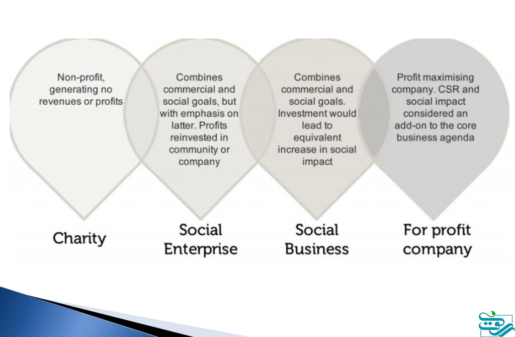 به عنوان مقدمه، کسب و کارها را می‌توان بر اساس اهداف اقتصادی – اجتماعی آن‌ها به چهار گروه مطابق شکل زیر، تقسیم کرد. گروه اول خیریه‌ها هستند که کسب و کارهای کاملاً با دغدغه‌ی اجتماعی بوده و صرفاً محلی برای خرج کردن منابع خیر بدون لزوم داشتن مدل اقتصادی برای اداره‌ی هزینه‌های جاری، در نظر گرفته می شوند. گروه دوم، کسب و کارهایی با هدف اجتماعی هستند که ترکیبی از اهداف اجتماعی و خودگران بودن اقتصادی را دنبال می کنند. در این گروه از کسب و کارها درآمدهای حاصل از فعالیت، در مسیر اهداف اجتماعی و پایدارسازی مالی هزینه می‌شود.