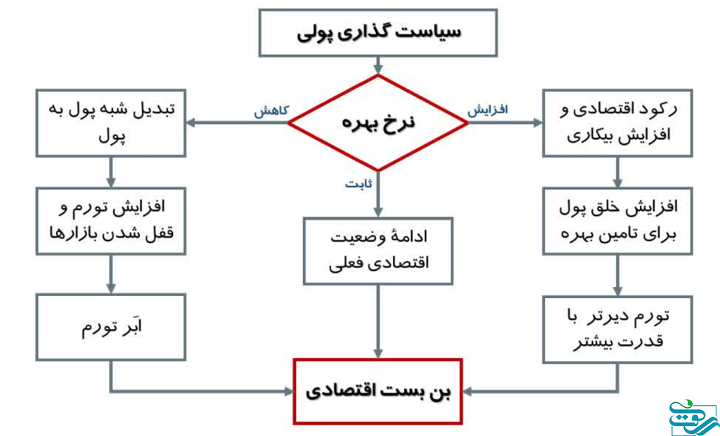 در وضعیت فعلی اقتصاد کشور، هرگونه سیاستگذاری پولی در بستر پول اعتباری و نظام مالی و بانکی، به بنبست اقتصادی میانجامد. در تصویر زیر، به هر یک از حالات افزایش، کاهش و یا ثابت نگه داشتن نرخ بهره و تبعات آن اشاره شده است.
